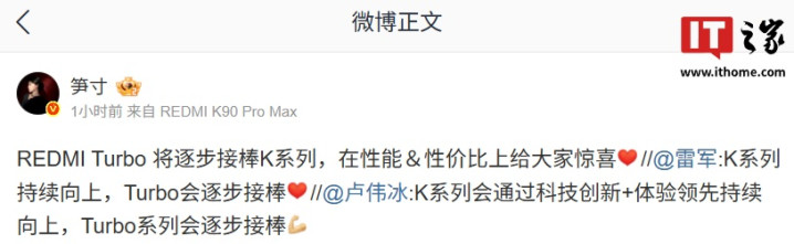 小米集团合伙人、总裁,手机部总裁,小米品牌总经理卢伟冰昨日发文表示:“K系列会通过科技创新+体验领先持续向上,Turbo系列会逐步接棒。”小米创办人,董事长兼CEO雷军也发文称:“K系列持续向上,Turbo会逐步接棒。”